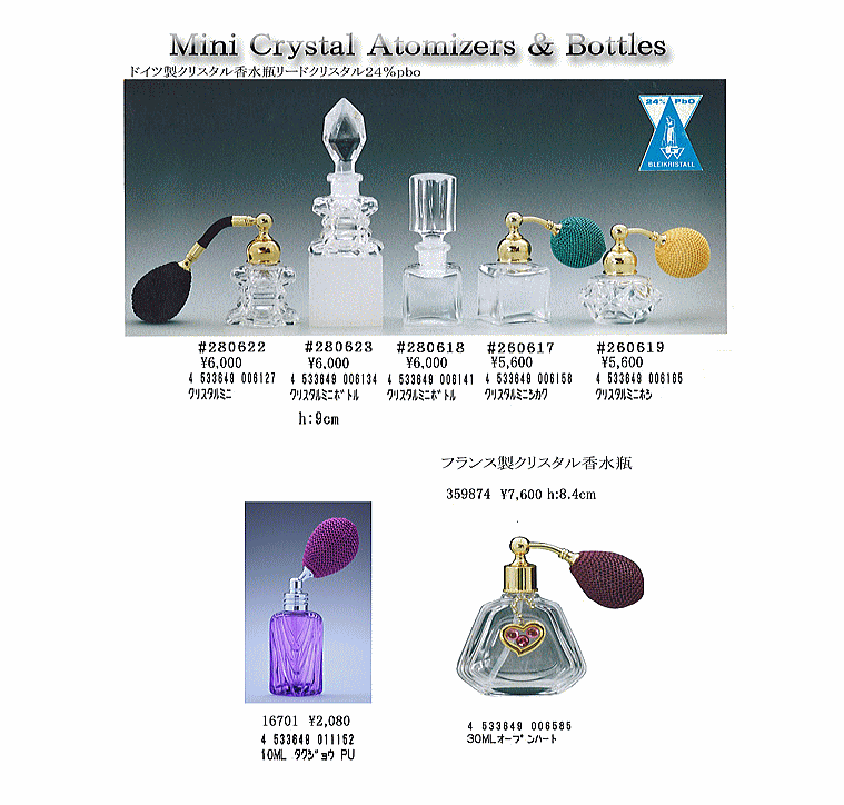 ☆☆☆レトロ風ドイツ製クリスタボトルや優美なフランス製クリスタルボトルのバルブアトマイザーは、映画の一シーンを思わせる優雅な時を奏でてくれる小物たちです。香りの演出を一段と引き立てるお洒落なデザインを香りにに合わせてお選び頂けます。 バルブスプレー金具はヒロセアトマイザー製です。